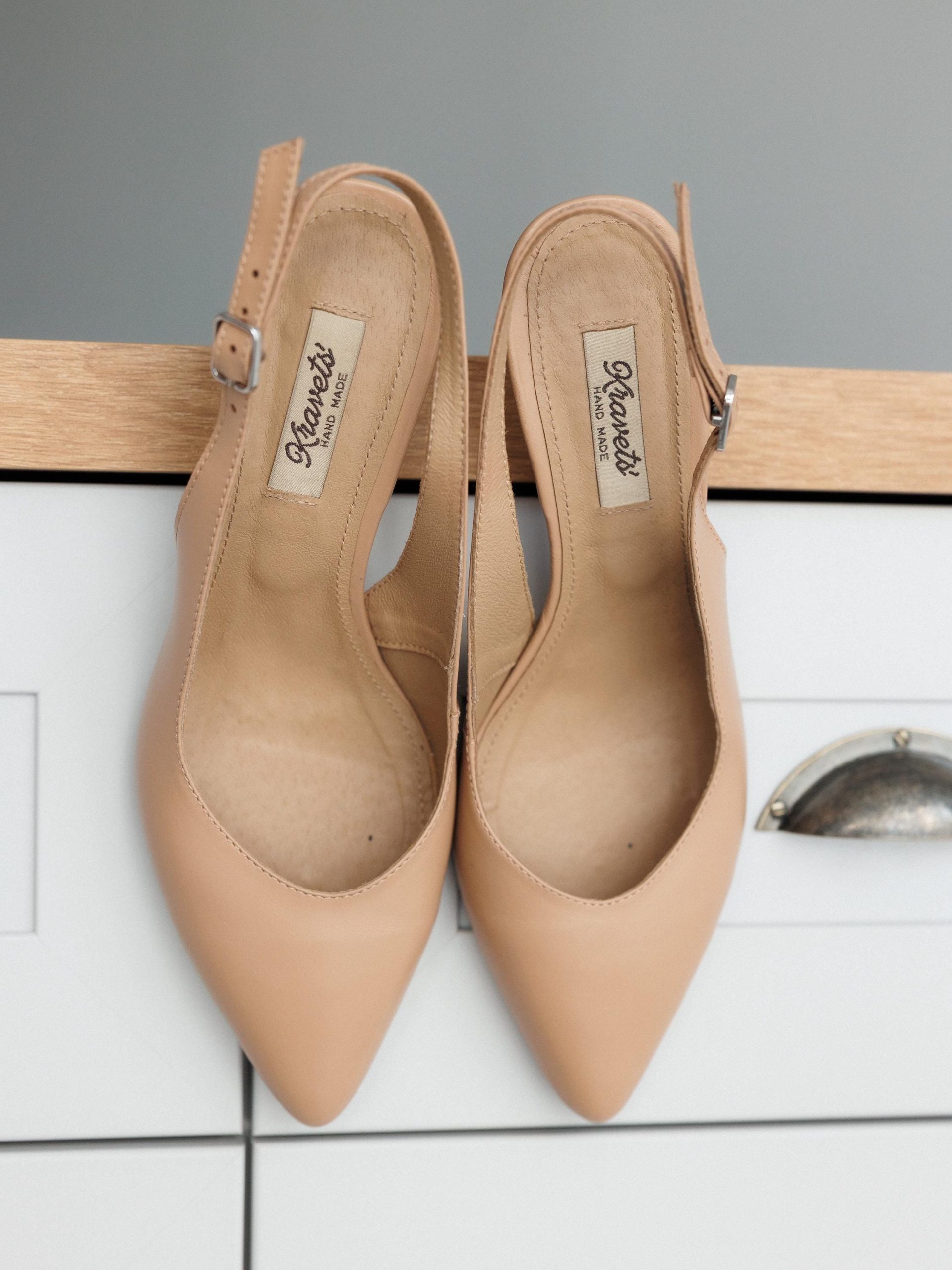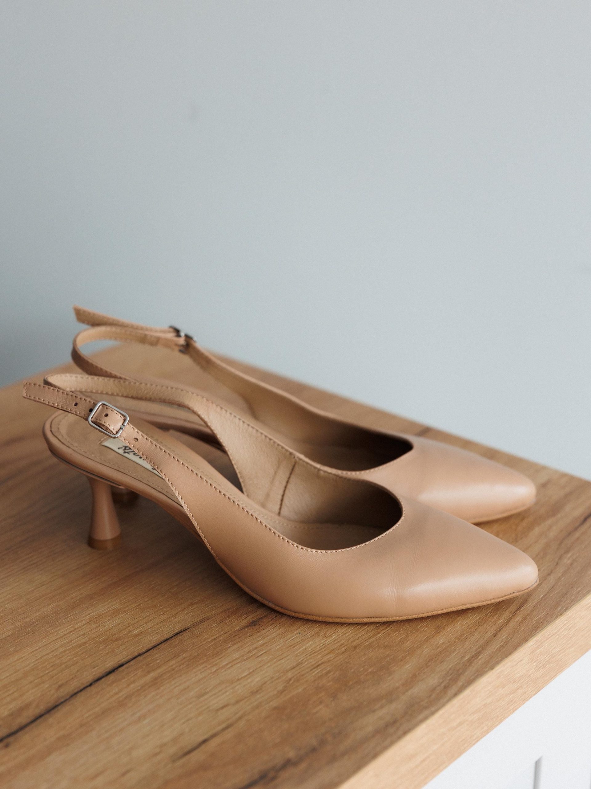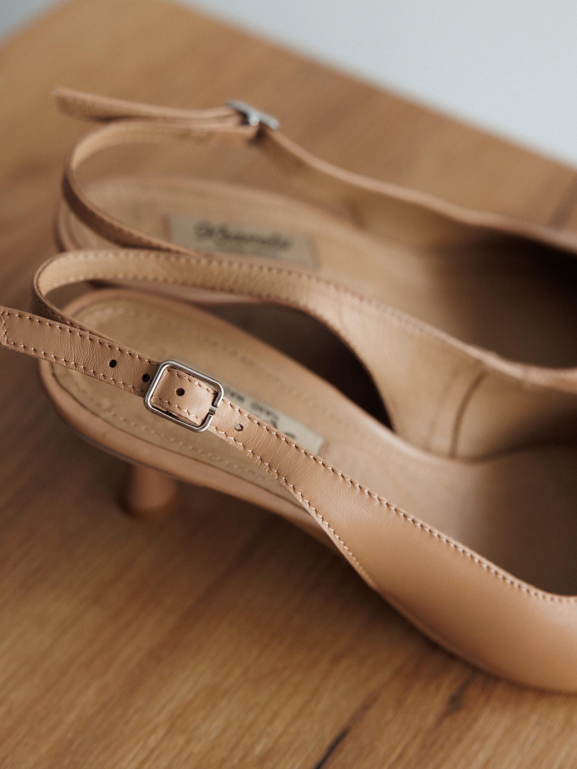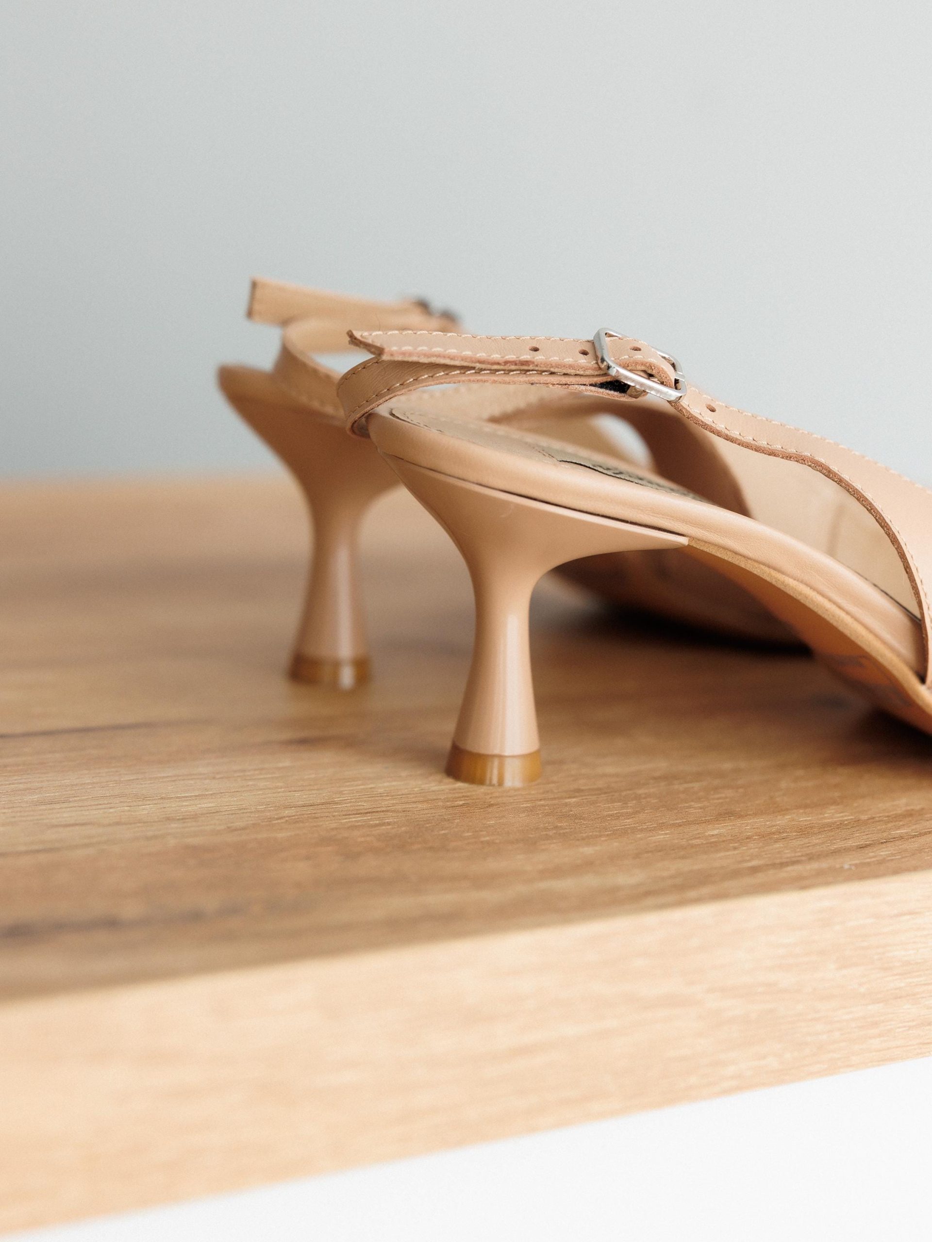 These are slingback sandals. They feature a 6 cm heel, a pointed toe, and an open heel. This is a very fashionable style this season.