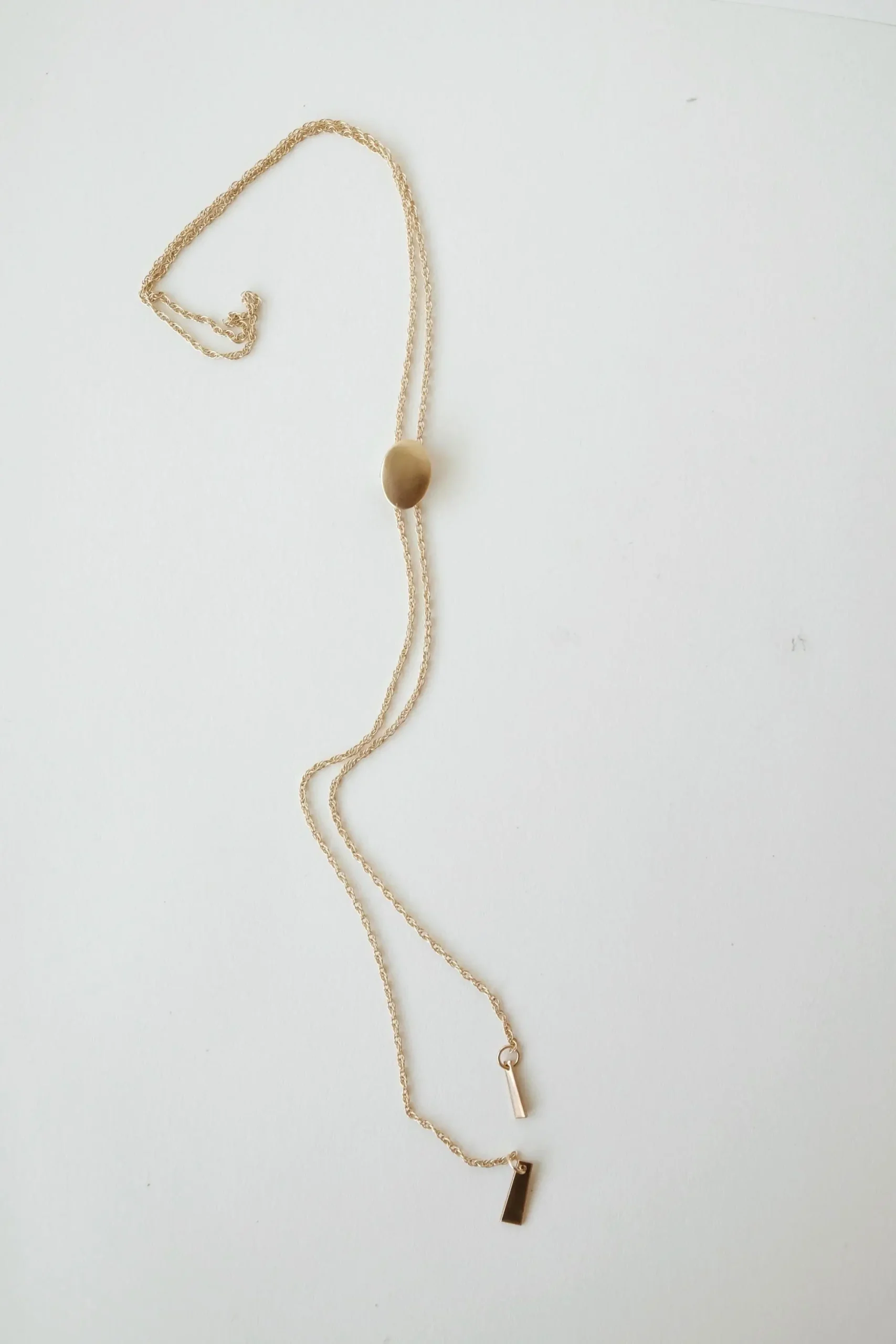 An understated but sexy little necklace. Tiny oval hand carved charm slides like a bolo tie on a rope chain finished with two drops.