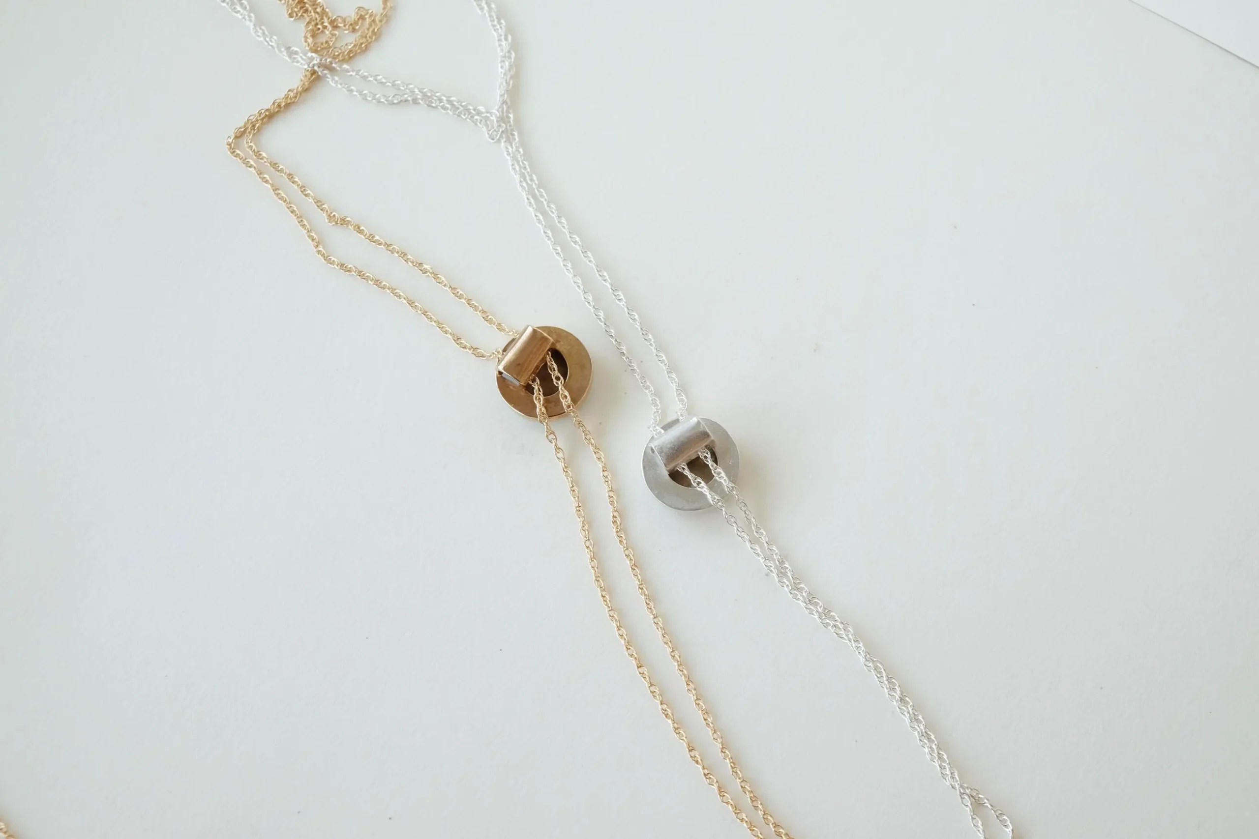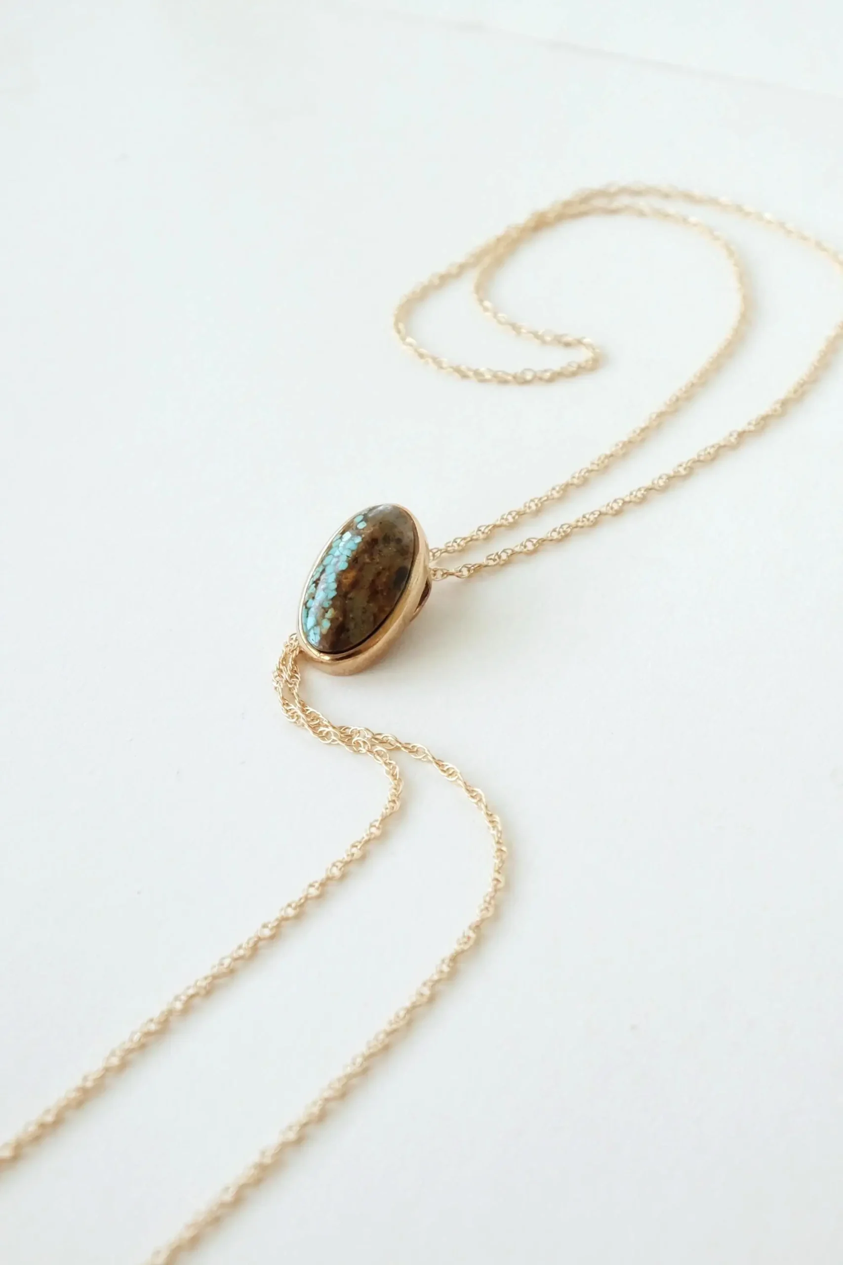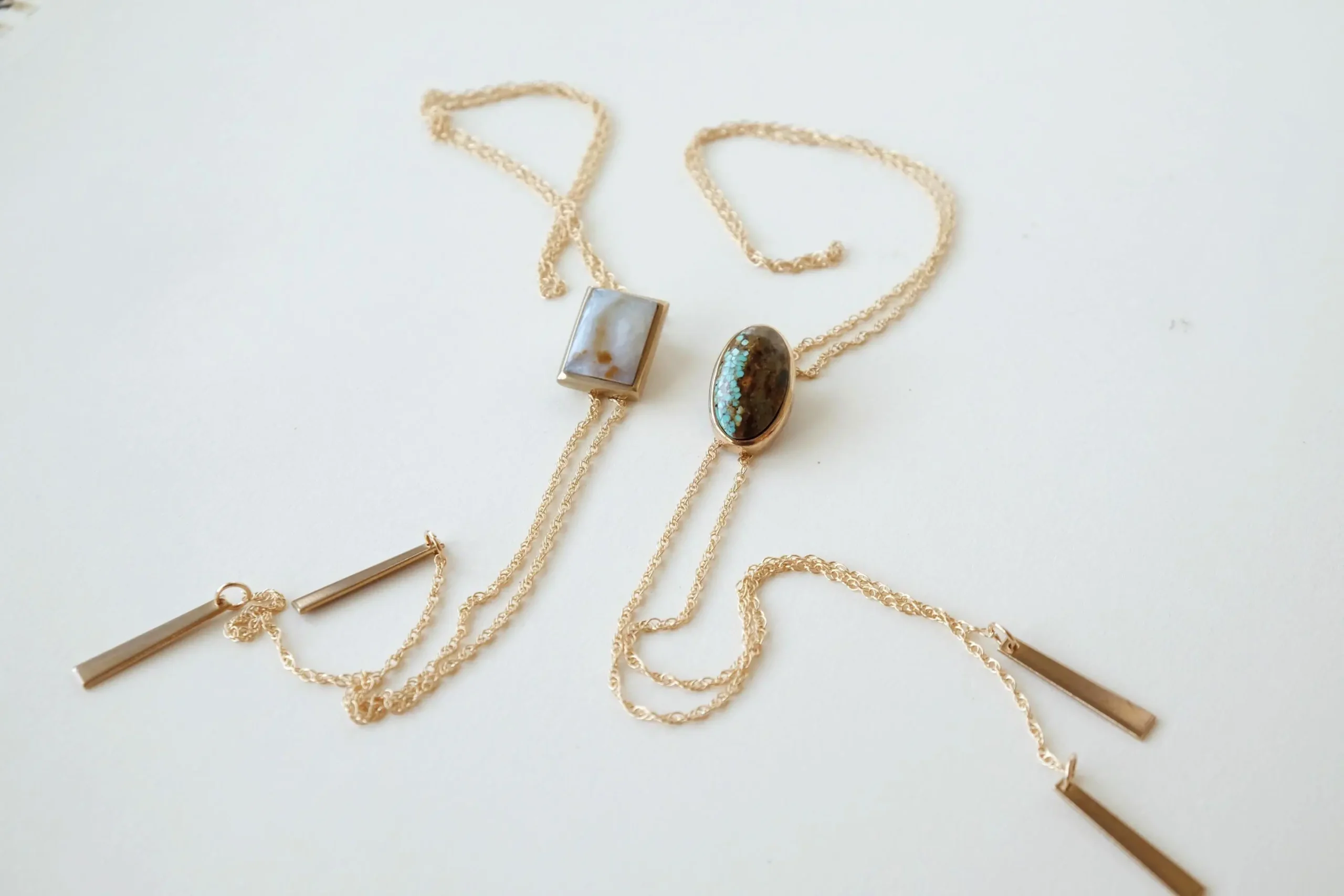 Hand cut and polished stones sit in a custom oval, round or rectangle yellow bronze setting. These slide on a gold filled rope chain finished with two yellow bronze drops. Secure and beautiful even from the back, two silicone beads are hidden in this original design, this hugs the chain firmly while sliding easily and staying in place.