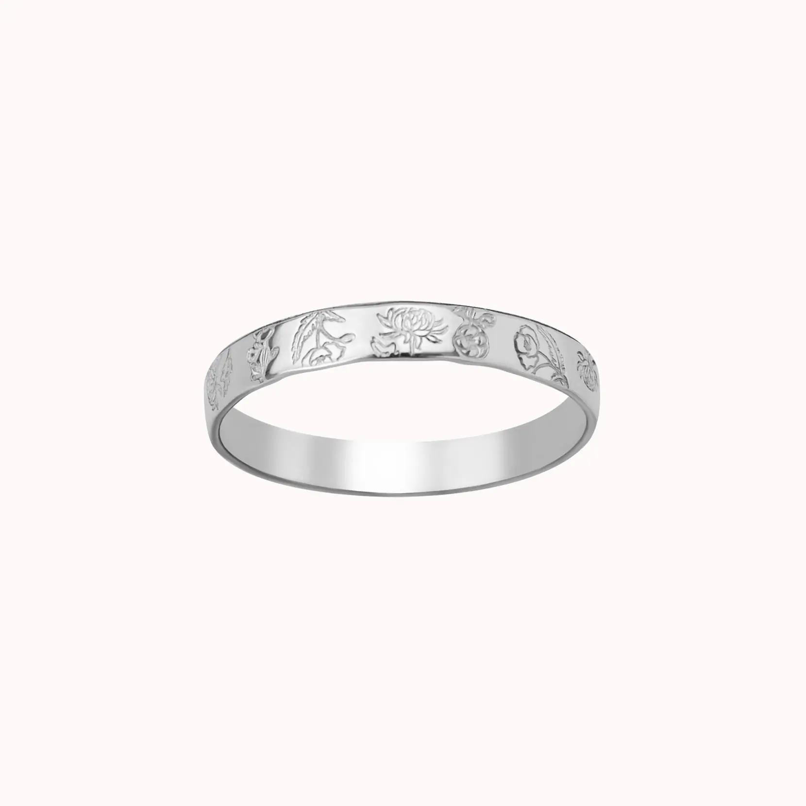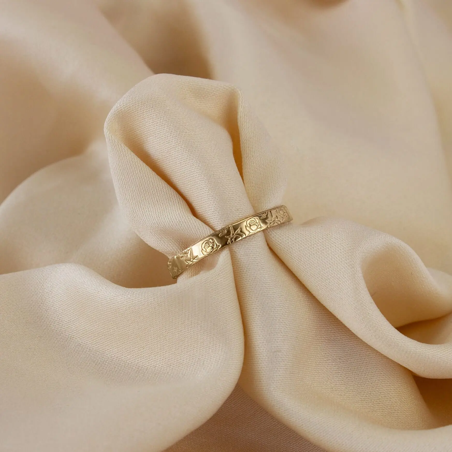 • Each band is hand cut + hand stamped to order, making them perfectly unique to you! Flowers will be stamped organically to fill up the entire band. Due to the nature of how these are made, there may be a thin seam at the back of the band which is considered a normal part of this beautifully organic floral ring!