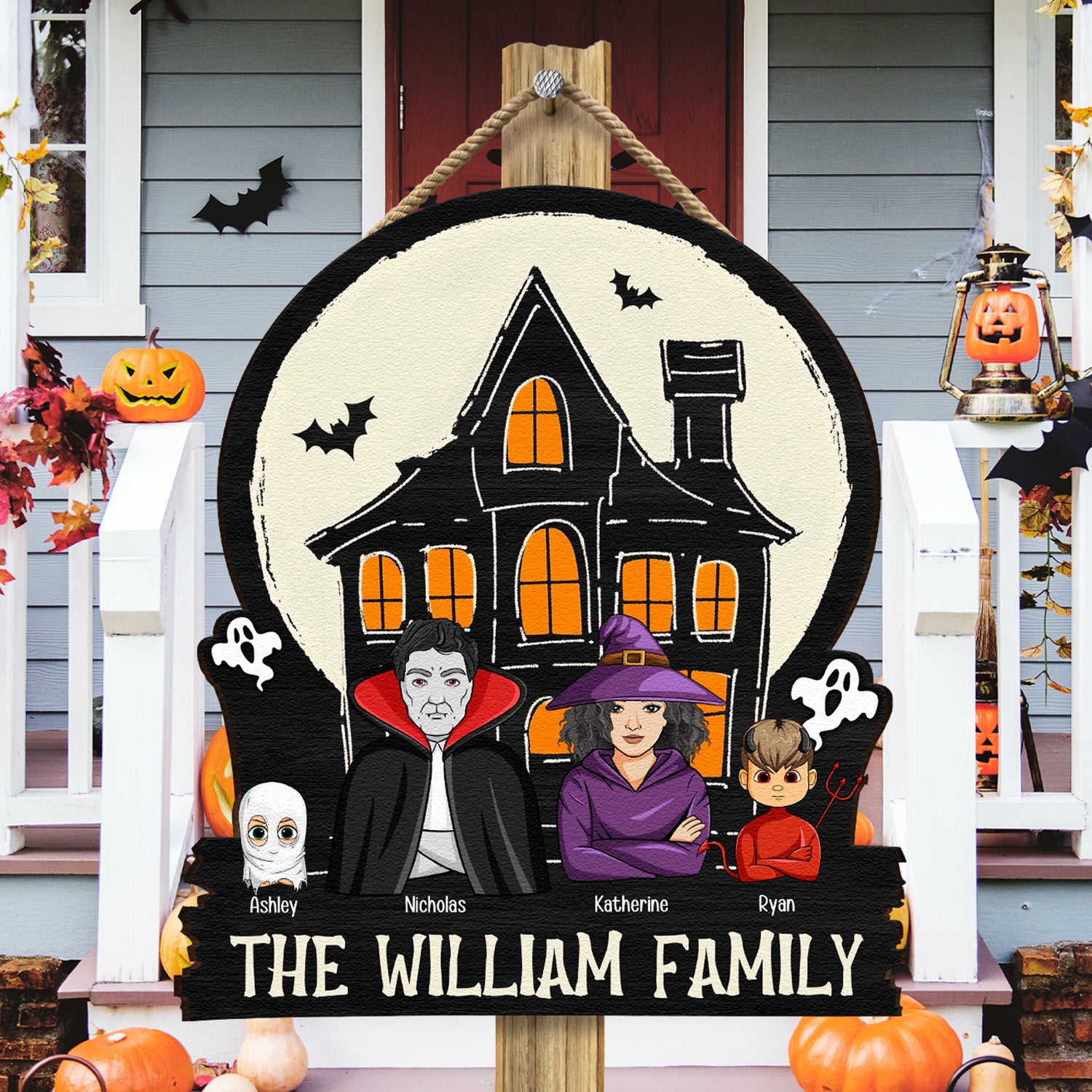 This Halloween wood sign also makes a fantastic gift for friends and family who love to celebrate the spooky season. It’s a thoughtful and unique present that shows you care about their holiday spirit and helps them create a festive and welcoming atmosphere. Whether hung on the front door, in the entryway, or as part of a larger Halloween display, the ‘Monster Family In Halloween Haunted Home – Personalized Wood Sign’ is sure to be a hit and a delightful addition to any Halloween celebration.