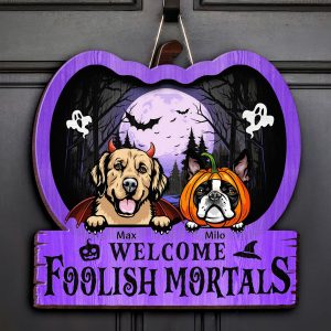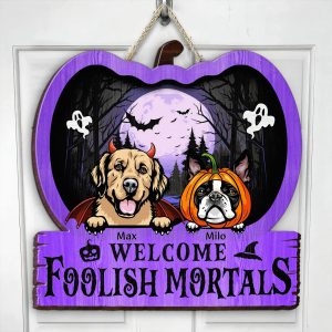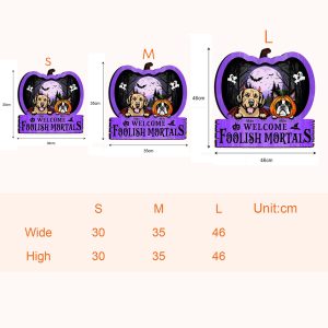 Welcome guests to your perfect home with our Welcome Foolish Mortals wood sign which is a special version for Halloween! Ideal for any dog mom, dog dad, or furry fanatic. This whimsical sign allows you to proudly display your love for all things dogs right at your door.